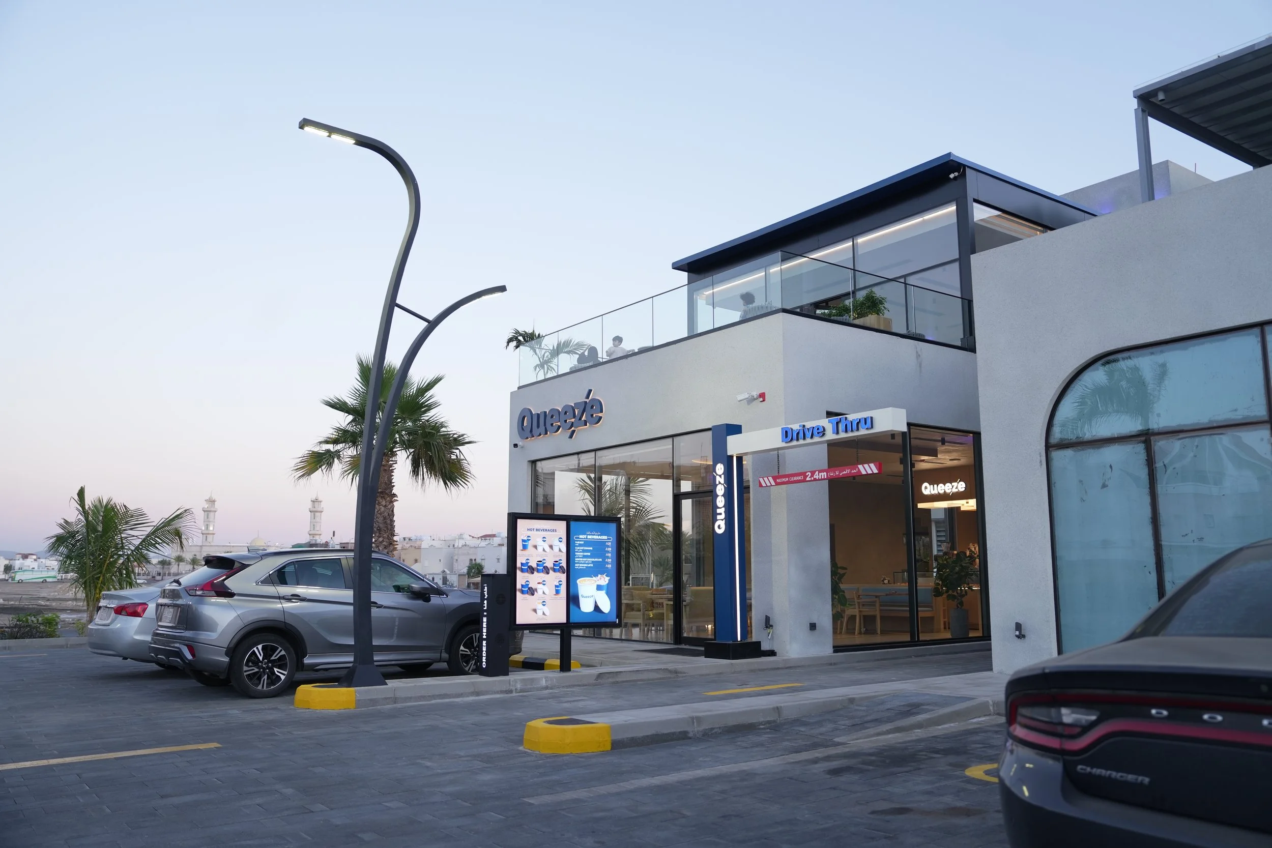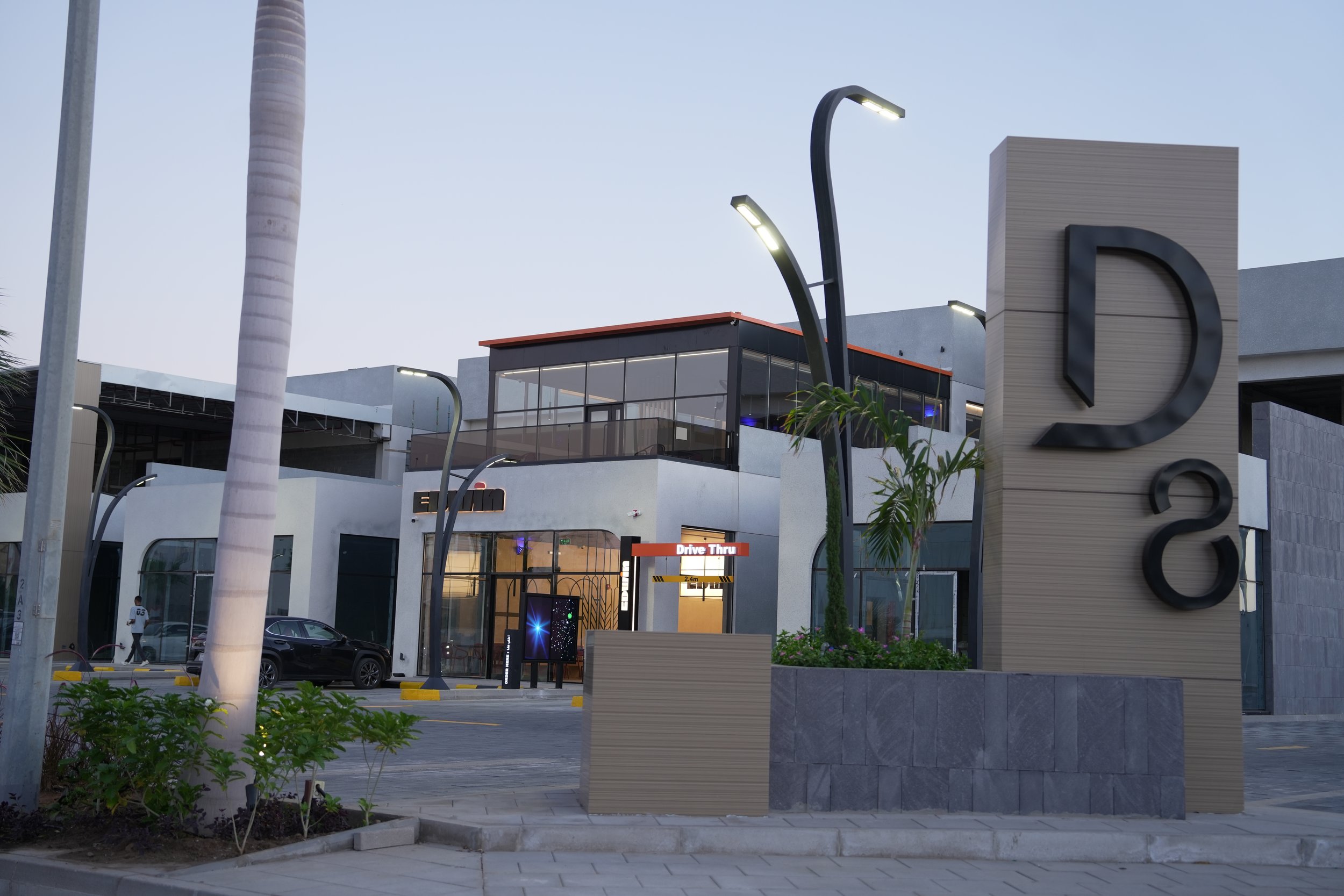A commercial strip in Jeddah originally configured with eight drive-thru units, resulting in conflicting vehicular circulation across the site.